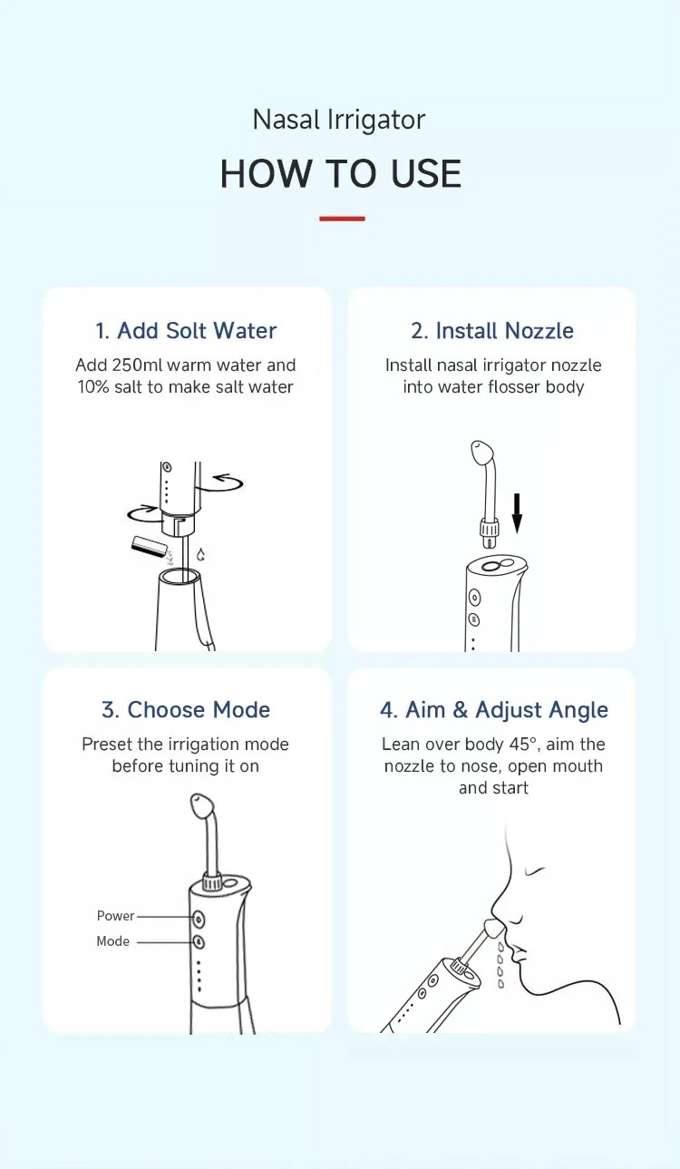 Работа с захранване: За разлика от традиционните ръчни назални иригатори, електрическите назални иригатори се захранват с електричество, като обикновено се използват акумулаторни батерии или AC адаптер.
