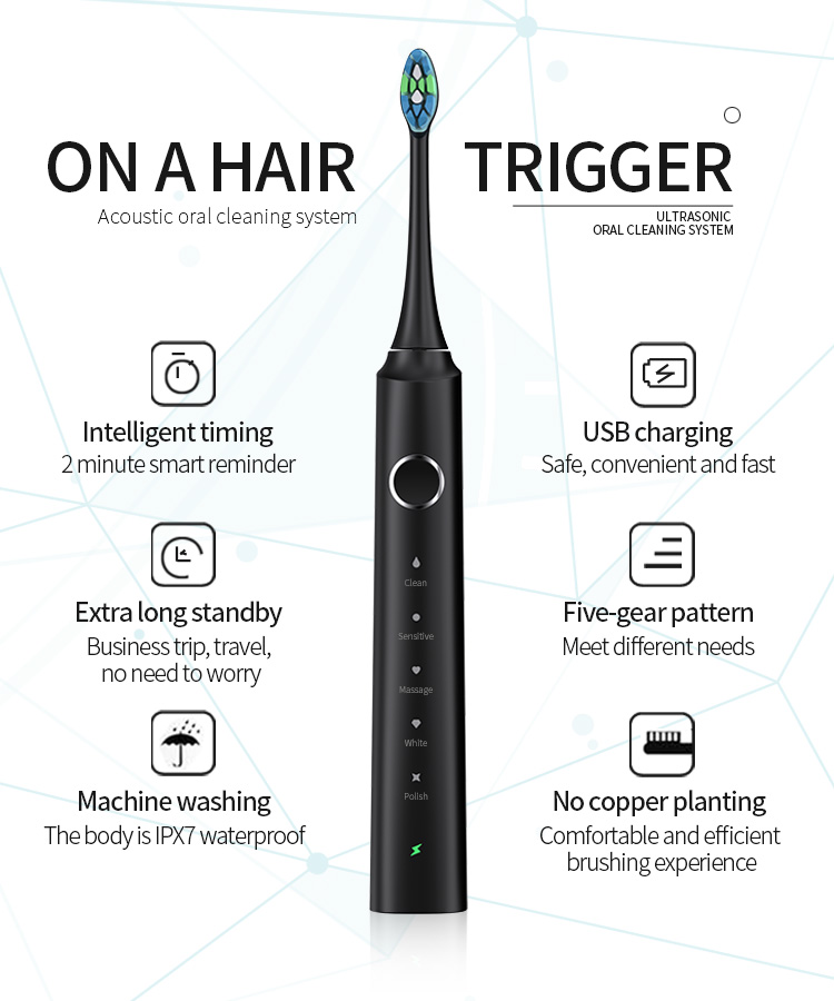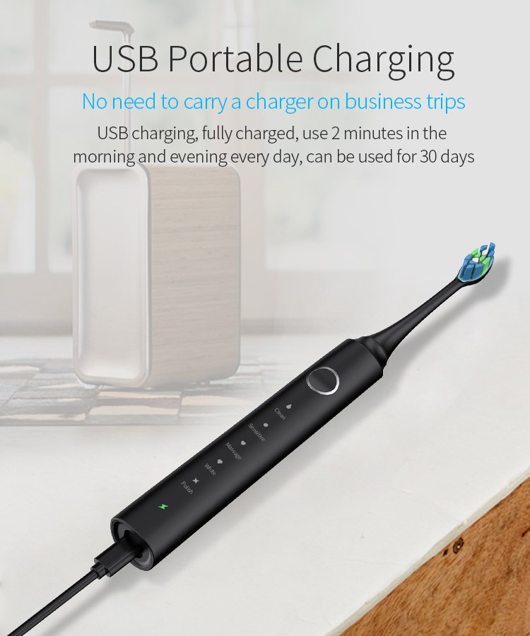- 5 ВИСОКОЕФЕКТИВНИ РЕЖИМА НА ЧЕТКАНЕ - Чисто (нежно), Бяло (силно), Полиране (силна инвертирана честота), Меко (нежно инвертиране на честотата) и Чувствително (меко), за да отговарят на различни състояния на зъбите или венците, така че можете да избирате различни режими според вашите предпочитания и препоръките на зъболекаря.