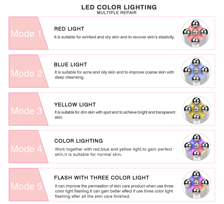 6-В-1 РУТИНА ЗА ГРИЖА ЗА КОЖАТА --RF проектирани 6 режима според ежедневната рутина за грижа за кожата. Те са #ПЕНЕТРАЦИЯ за подобряване на абсорбцията от кожата, #ПОЧИСТВАНЕ за цялостно почистване на лицето, #СПЕЦИАЛНИ за грижа за очите, #ПОВДИГАНЕ за стягане и стягане на кожата и #ОХЛАЖДАНЕ за успокояване и стерилизиране на кожата.