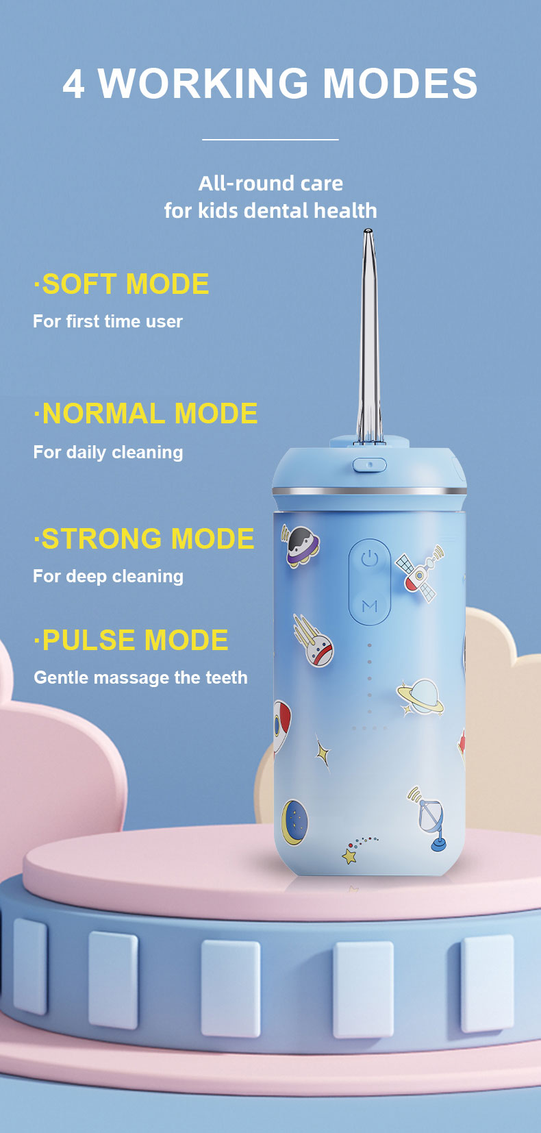 - 4 Mode,2 Types of Jet Tips: We designed the water dental flosser with safe water pressure while ensuring optimal cleaning. As your child grows, there are three age-appropriate water pressure levels, plus a massage mode. With a professional orthodontic nozzle, the front end is designed with soft bristles that will not damage braces and children's delicate gums. Tips: When the power is turned off, press and hold the power button to enter the flashing state to adjust the corresponding mode.