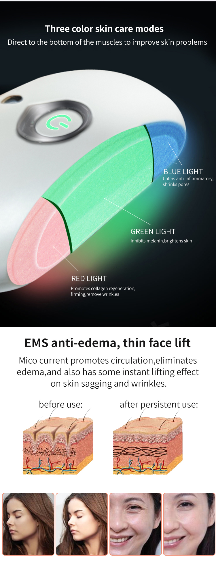 Три цветни режима за грижа за кожата, Директно към дъното на мускулите за подобряване на кожните проблеми