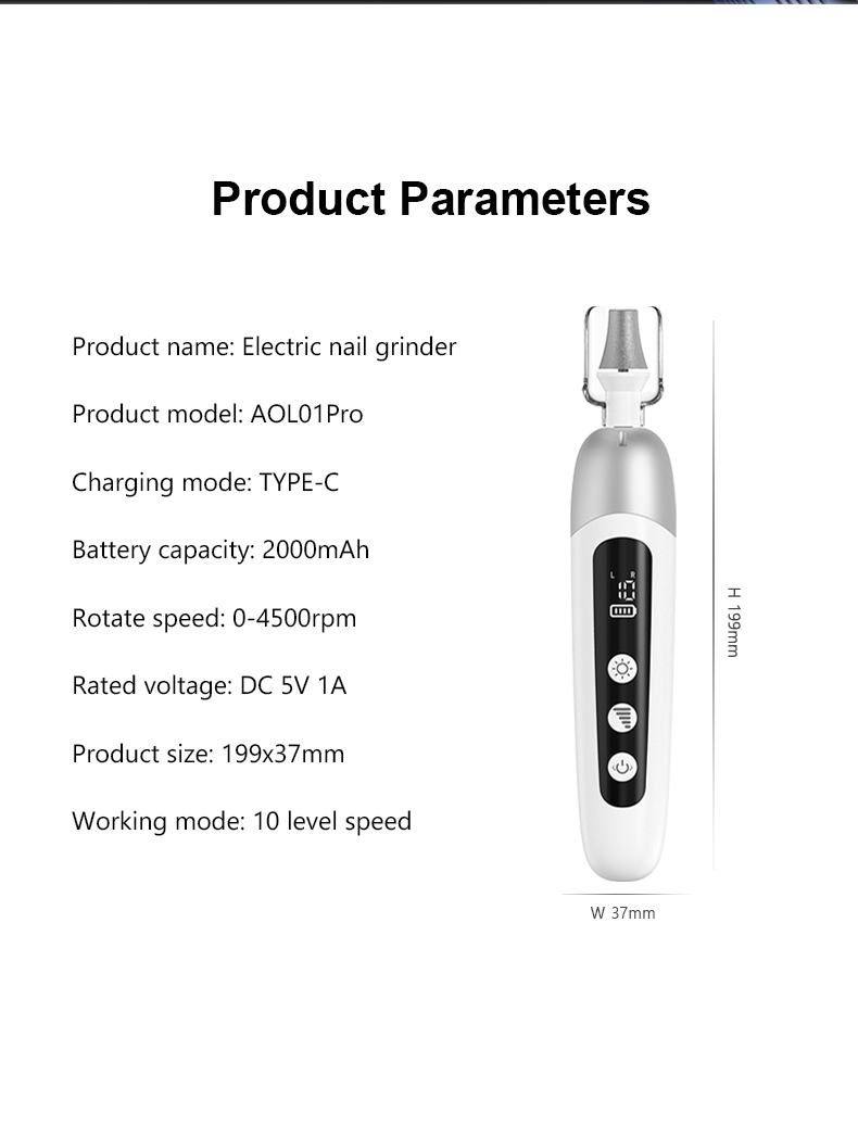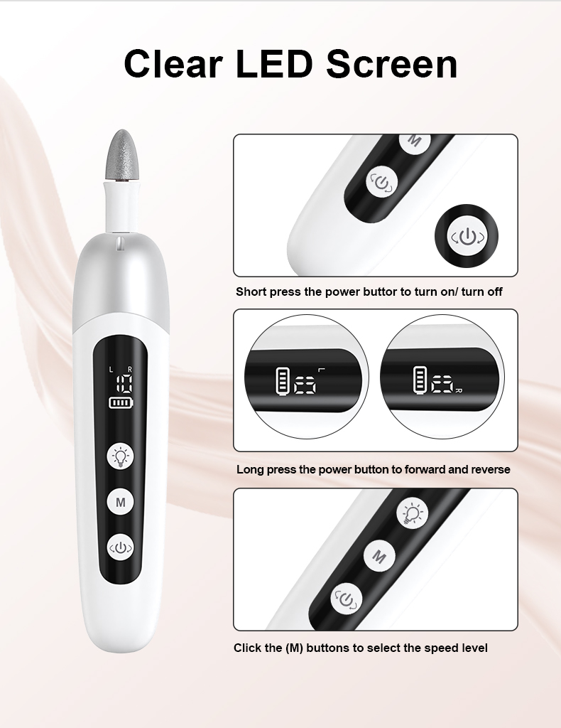 - ИНОВАТИВЕН LED ДИСПЛЕЙ: Навигирайте безпроблемно с желаните настройки с лекота. LED дисплеят показва състоянието на батерията, предпочитанията за скорост и настройките за въртене за безпроблемна работа. Електрическата машина за пила за нокти също е оборудвана с вградена LED светлина, която осветява зоните на ръцете и краката