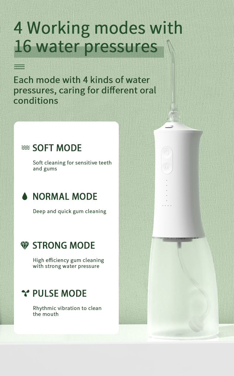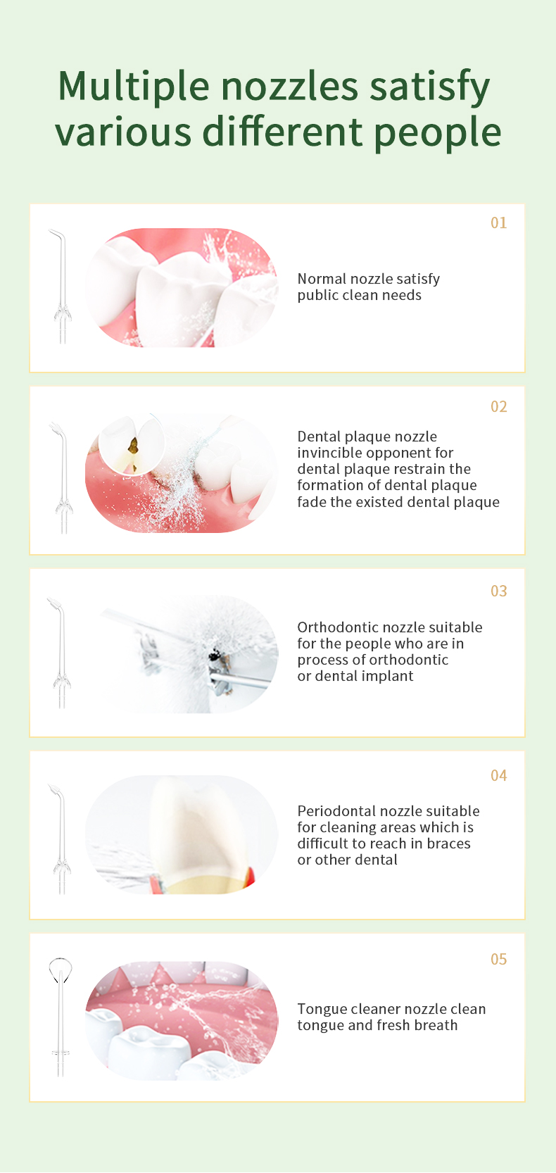 Тази водна щипка за зъби доставя импулси с високо водно налягане при 1400-1800 пъти в минута, като ефективно премахва 99,9% от зъбната плака за дълбоко почистване на зъбите. Тази водна щипка за зъби масажира венците, насърчава кръвообращението и се справя с орални проблеми като лош дъх, ортодонтски зъби